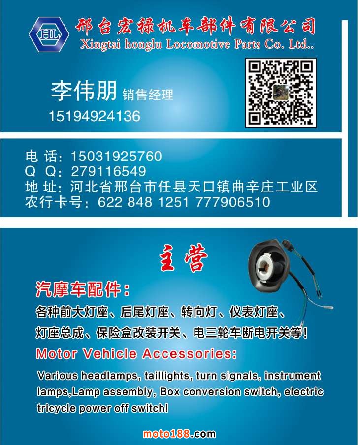河北邢臺(tái)宏祿機(jī)車部件有限公司:主導(dǎo)產(chǎn)品有:摩托車各種型號(hào)(前大燈座)、(后尾燈座)、(保險(xiǎn)盒)