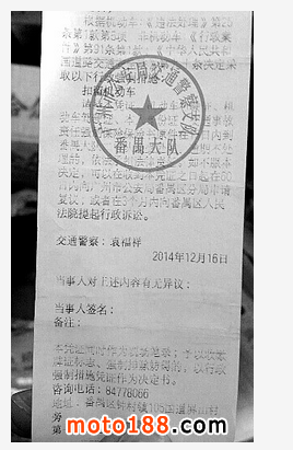2014年12月16日,肇慶摩友陳先生騎摩托車經過番禺鐘村105國道時,恰好遇到交警路邊執法。其停車后出示了行駛證、駕駛證、身份證等證件。