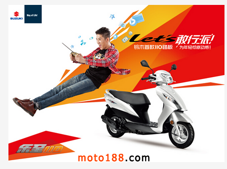 與以往的鈴木踏板的相對低調(diào)保守相比,“敢行派,為年輕徹底動感!”鈴木樂至110新品廣告語透露出強(qiáng)烈的信息:這款鈴木2015年向中國市場年輕消費(fèi)者推出的首款踏板,無論動力,潮流設(shè)計(jì),都很任性!