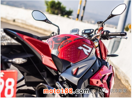 不過粗壯的倒叉及塞滿整個土除后方空間的大面積水箱、油冷排,還是能讓人看的出那源自S1000RR的性能基底啊!