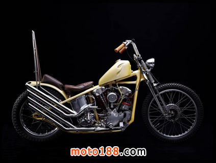 盡管從名字和作品的外觀看來,Hawgholic Motorcycles的總部設立在東京,其專注于將復古的哈雷摩托打造為特別的創造物的地方。這是一臺1945年產的Knuckle chopper,充滿活力的亮黃色的漆色,四排氣管和一個改良的倒U形靠背。它于2011年被重新打造。