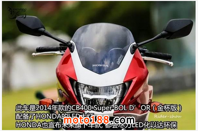 核心提示: CB400 SB版即CB400 SUPER BOL D'OR 在國內(nèi)很多摩友也叫他CB400金杯版, 至于為何叫金杯版,主要是為了紀(jì)念法國著名耐力摩