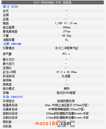 TC85是100%濃縮版專業泥地賽車,除了先前提及的精良的懸掛系統,如此小巧的水 冷式2沖程引擎同樣備有生與死氣調控活門,更意想不到的是那孖水箱設計,在大部份情況下,如此級數車子通常只配單水箱,孖水箱設計特顯此車的耐力,幾近逞 1:1設計的缸徑與活塞行程比例,47mm X 48.95mm,這是盡可能兼顧高轉速與高扭力實際表現的落墨。