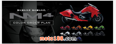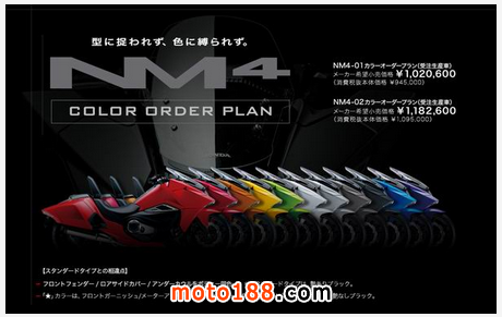 Honda 上個月宣布向本土市場提供多個顏色的 NM4-01/NM4-02(標配了尾部的邊箱)訂制方案。NM4 系列采用與 NC750 系列類似的一副水冷四沖程直列兩汽缸、DOHC 每汽缸四汽閥的發動機,排汽量 745 cc,PGM-FI 電子燃油噴注系統,六檔的齒輪箱。這個新的訂制方案,實際上就是在標準的兩個車身顏色(黑色、白色)基礎上,另外多提供九個特別的、需要客戶提前預訂的車身圖案,讓 NM4 系列在本土市場提供多達 11 個顏色予客戶選擇,在滿足消費者對個性化的需要之同時,也更符合廠方當初對 NM4 系列的 “ 更接近未來 ”、“ Cool ” 的設計理念。