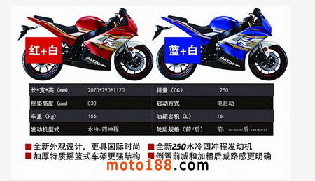 白色、紅色、藍色三種可選顏色,全新顏色外觀更具國際時尚、運動元素,這看上去非常性感。男人不一定會承認,但是他們喜歡騎摩托時得到的關注。大多數女人也發覺這很惹火。套組的顏色搭配非常奪人眼球,看上去充滿了陽剛之氣。