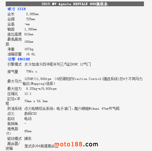 不論是BRUTALE 800還是RIVALE 800,也是使用同廠的直列3汽缸引擎,而新引擎的缸徑雖然跟675的79mm相同,但沖程卻由45.9mm增至54.3mm。從這方面來看,跟講求中、 高轉輸出的675引擎相比,擁有較長沖程的新引擎相信可照顧低扭輸出方面的需要,使馬力輸出有更廣闊的Powerband,并配備了ABS防鎖死剎車系統 及快速電子升檔器,更適合日常駕駛需要。