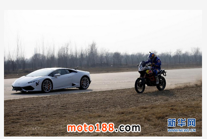 新華社供本報體育專電 一場備受關注的兩缸后驅“山野之王”挑戰V10四驅“公路猛獸”的跨界對抗昨日在北京八達嶺長城腳下的延慶機場舉行。結果,越野摩托車在三輪對抗中全部敗給超級跑車。