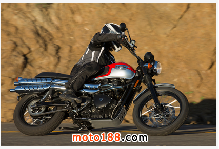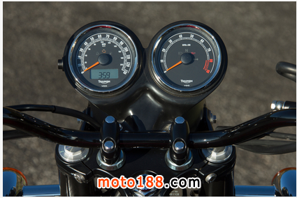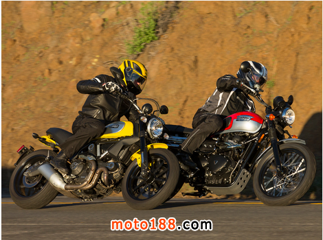 從Ducati與Triumph對比研究。凱旋感覺舒適寬敞,包容和寬松相比,特別是與乘客; 長雙乘坐起來相當(dāng)過癮這種摩托車。然而,對于運(yùn)動(dòng)騎它的馬力,靈活性和前制動(dòng)感覺就不能和現(xiàn)在的車種相比較。但正如我們花更多的時(shí)間在我們長大習(xí)慣的改變坐姿; 雖然落后一點(diǎn)的剪切和推力騎相比Ducati,凱旋高高聳立在它自己的優(yōu)點(diǎn)。其59.0英寸的軸距,28度轉(zhuǎn)向耙和517磅的濕重全部加起來更大,感覺一個(gè)更重要的沉著和隨和的性質(zhì)。盡管其較低的52.8馬力的峰值,仍然有足夠的扭矩在手的樂趣并在865cc的270度的曲柄,風(fēng)冷,八閥門廠與5速變速箱使發(fā)動(dòng)機(jī)人物和引人入勝的感覺。