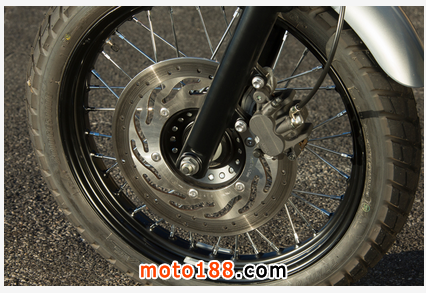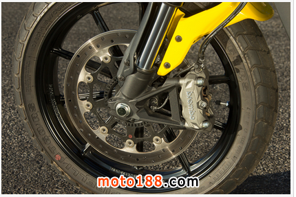 6速變速箱可以讓大量緯度的檔位選擇。憑借其短軸距,低體重和陡峭的24.0度的轉(zhuǎn)向耙,Icon感覺靈活,反應(yīng)迅速,俏皮的,甚至最嚴(yán)格的曲折山路。徑向安裝單轉(zhuǎn)子4活塞的Brembo 330毫米前剎車提供了出色的制動(dòng)力和感覺,而ABS是不侵?jǐn)_。然而,其不可調(diào)41毫米倒叉和預(yù)緊可調(diào)單沖擊,無論是5.9英寸旅行,證明太軟,以及缺乏反彈現(xiàn)在阻尼感覺更加明顯。另外一個(gè)小的抱怨:在中央速度表在明亮的日光的讀數(shù)/轉(zhuǎn)速可能很難看到。