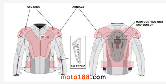 裝在衣服上的感應(yīng)器以30-60毫秒為持續(xù)監(jiān)測騎乘狀況,當(dāng)車主處于摔車或是其它傷害風(fēng)險時,系統(tǒng)可以在25毫秒內(nèi)完成氣囊的充氣!