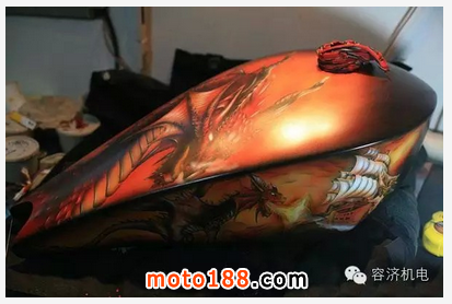 一個小小的油箱上,龍是活著的,并且如此淋漓盡致,當龍跟摩托車結合在一起的時候,就是一件活著的藝術品。彩繪的過程是痛苦的,新入手的愛車為了披上美麗的外衣,被拆的七零八落。油箱上面的彩繪,打掉原漆的時候,手顫抖了。。。。。。