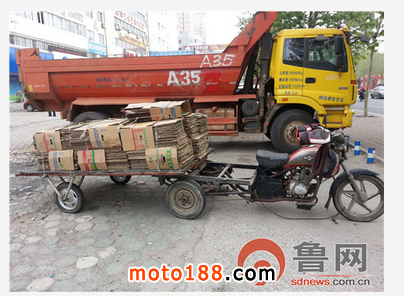 無獨有偶,當民警正在處理該名三輪車駕駛員時,路邊看熱鬧的市民突然招呼民警:“警察同志,看看這輛摩托車吧,也夠奇特的。”民警走過去一看,在路邊建行停車場門口停著一輛摩托車,民警數了數一共五個輪子,民警圍著這輛“五輪”摩托車轉了一圈上下左右觀察發現,該車是一輛三輪摩托車改裝的,駕駛員把原來摩托車的車廂拆下,然后又加了一個長約3米,寬約2米的平板,在平板的下方又焊了兩個車輪用來方便拖拽,在平板上,還垛滿了紙箱。民警注意到,該車車廂和車身的連接處只有一根細細的固定軸連接,該車經過改裝后,拉的貨物是比以前多了不少,然而,連接的固定軸一旦斷裂,駕車人和其他行人的安全就會受到威脅。就算是固定軸沒有斷裂,這樣的車上路,也是極大的安全隱患。
