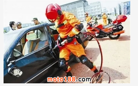 最新消防摩托車的型號為春風650,從外表上看和普通摩托車區別不大。破拆摩托車的后面和兩側箱子內裝有液壓剪切鉗、液壓擴張鉗和液壓頂桿等專業的破拆救援設備,可以快速到達現場,第一時間進行破拆處置。