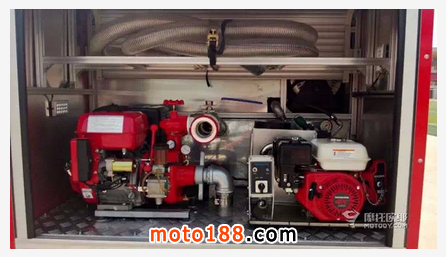 滅火摩托車則帶有兩罐共40升水,并配以細水霧水槍,可以快速到場,迅速撲滅初起火災,水槍有開花、直流兩種出水方式,分別適于撲救人體火災和汽車火災。