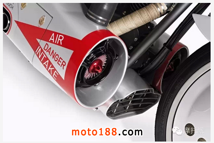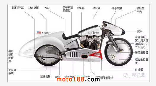 B-Rocket的設計與技術原創(chuàng)特色,還有車身兩側如噴射機引擎的渦輪,后者加強排氣推動以加速。渦輪內裝置兩種嶄新過濾器,右邊過濾器可以進風,左邊的有助冷卻機油;手工制鋼護柵在接合璃合器及剎車碟時可以保護液壓缸,兩個渦輪裝置在鋼護柵兩邊;對稱雙渦輪性能強勁,功率重量比(power weight ratio)勝人一籌,同時提升了「飛行摩托車」外觀。