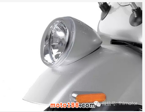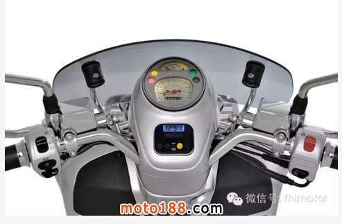 既然大燈下移,車頭部分自然清爽了許多。鍍鉻行李架,無燈設計車把加上擋風板,美觀、實用且對味!而儀表和車把更加有特點,有點類似于LXV車型,方向柱蓋采用機械圓形儀表,油量顯示和時速表完全分開,下方還有單獨時間顯示和功能提示燈,讓人一目了然。車把采用裸露設計,燈光控制鍵居左,啟動功能鍵居右。