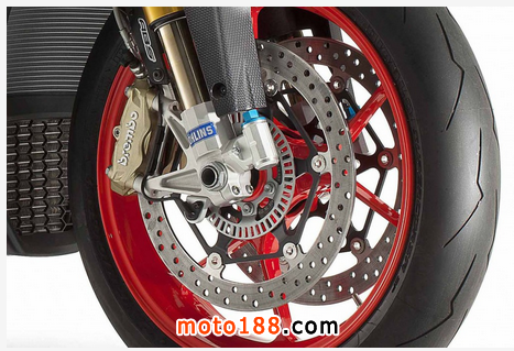 V4 1100 RR 與Factory 在制動上則盡乎相同,同樣使用BREMBO M432 輻射對四搭配320mm 大碟,不過Factory 的浮動扣采鋁合金材質(zhì)。