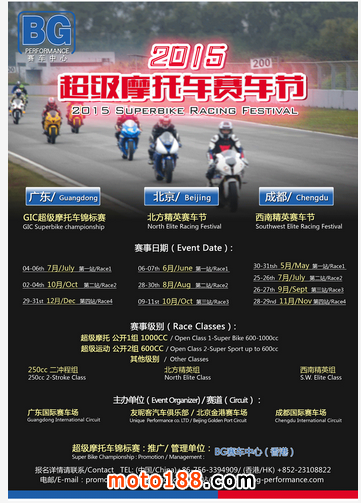北京:2015年,BG亦與北京友昵客汽車俱樂部/北京金港賽車場再次合作,在北京的北方精英賽車節里,舉辦3站超級摩托車錦標賽事。