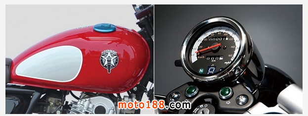 核心提示:◆水滴形油箱烤漆采用汽車級珠光材料,高純度色彩配以水滴造型的偏口油箱設計,更顯復古時尚。 ◆歐式單只簡約里程表古簡風格的