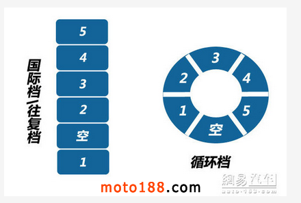 國際檔的檔位順序為1-空-2-3-4-5,空擋在1擋和2擋中間,也被形象的成為踩1勾2,這種排列方式能夠有效避免誤操作,也是目前比較普遍的檔位順序。循環檔的排列順序為:空-1-2-3-4-5,向上挑是升檔,向下踩是降檔,反復循環,簡單好記是這種排列方式變速器的主要特點。