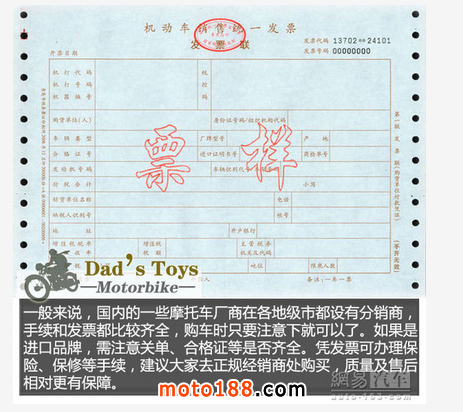 一般來說,國內的一些摩托車廠商在各地級市都設有分銷商,手續和發票都比較齊全,購車時只要注意下就可以了。而進口摩托車則分為大貿車、小貿車、水貨車等等。大貿車主要是指有完整關單、稅單以及保修等一系列手續的車型,而小貿車則屬于稅金上有一定折扣、配額數量有限制的車型。簡單的說,大貿車就像你去4S店買車,手續正規齊全,可以上保險。小貿車有點像去二級經銷商買車,需要一定的過戶周期,保修上也有很大限制,盡管價格便宜,但并不透明,也可以上保險。