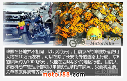牌照在各地并不相同,以北京為例,目前京A的牌照辦理費用大約在10萬元左右,可以在除了長安街外的道路上行駛。京B的牌照約為1000多元,只能在四環以外的地區行駛。關于牌照標準這個事情屬于另外一個話題,有機會我們可以再細談。目前大多數機動車管理所都可以申請辦理摩托車牌照,只要將發票、關單等原件攜帶齊全即可辦理。