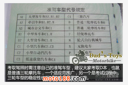與汽車駕照相同,摩托車駕照也需經過正規駕校的培訓考核,目前考試內容分為:交規、路考以及安全道德三項。其中交通標志、法律法規等與汽車并無太大區別,對于摩托車駕駛的基本常識也有一定涉及,如果您報考的是三輪摩托車,通過考核后會獲得D本的駕照,可駕駛三輪或兩輪摩托車。如果您報考的是兩輪摩托車,駕駛本上則顯示E本,僅能駕駛兩輪摩托車。