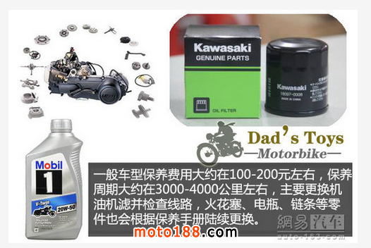 一般車型保養費用大約在100-200元左右,保養周期大約在3000-4000公里左右,主要更換機油機濾,火花塞、電瓶、鏈條等零件也會隨著保養過程中陸續更換。進口車型的費用略貴,基本是國產車型的1-1.5倍左右。另外,部分品牌對機油等消耗品有特定要求,具體可以參考用車手冊或店內的價格標準。