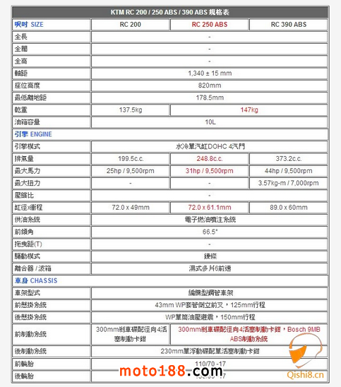 心水清的讀者都會(huì)清楚,KTM RC小跑車系列主攻入門級(jí)市場(chǎng),她們同樣配備單汽缸引擎、相同的輪框、包圍、制動(dòng)及尾擔(dān)等等,但整體設(shè)定按照不同版本的馬力輸出經(jīng)過(guò)重新設(shè)定。至于夾雜于200與390之間的RC250 ,雖然配置大致相同的裝備,但就新加了鍛造的上下眼鏡及新的PASC防鎖死式離合器 (PASC™),令急速退檔時(shí)避免Engine Brake鎖死尾輪,同時(shí)讓退檔過(guò)程更順暢,另外車輛也配備Bosch 9MB ABS防鎖死煞車系統(tǒng)、43mm WP倒立前叉、WP單筒油壓尾避震、編織型鋼管車架等等,但250版的引擎排氣量是248.8c.c.,馬力輸出31hp。