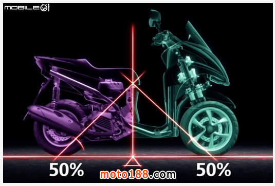 Tricity 采用非常標準的前后 50% 配重,因此在騎乘時可以明顯感受到車頭的重量分布比以前騎乘的 125 c.c. 級距速可達重上許多,不過相對的車尾重量反而有減輕的感覺,在市區騎乘時這樣的重量分布能有效增加車體靈活性,讓 Tricity 更適合市區道路騎乘。
