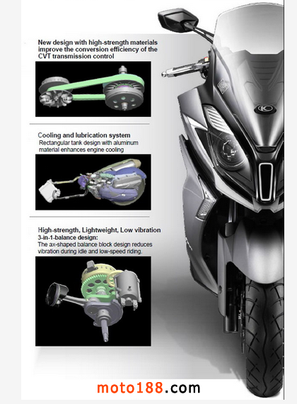 水冷式四沖程單汽缸320.6c.c. OHC 4汽門引擎,偏重于扭力表現,2.9kg-m/6,500rpm對比300i的2.7kg-m/6,500rpm,請大家不要低估那0.2kg-m的扭力 在實際應用時的差別:放棄了馬力峰值而偏重扭力表現是針對雙騎的韌力,又或起步、上斜坡至窄路掉頭之類,以並非追求高速表現的車子,30ps/7,750rpm馬力已綽綽有餘。