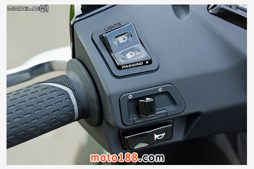 左把手的開(kāi)關(guān)部分,從上到下分別是遠(yuǎn)燈/近燈/超車(chē)燈開(kāi)關(guān)、方向燈開(kāi)關(guān)與喇叭按鈕,超車(chē)燈采用小型速可達(dá)的設(shè)置方式,騎乘時(shí)若要使用超車(chē)燈比較不方便一些。