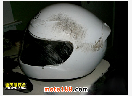 這張圖片應該大家都有印象吧,這是在以時速70mph,約112km/h發生事故,頭盔在地上滑行的慘狀。如果用劣質的安全帽,其實跟沒帶是一樣的效果。