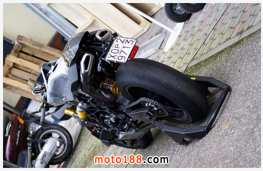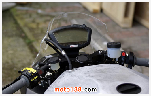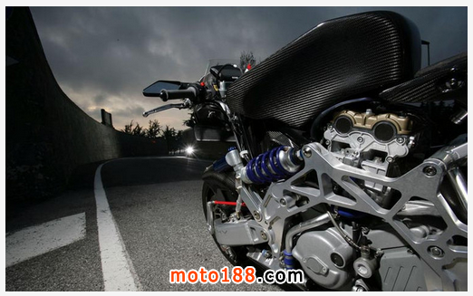 留意即使在行車時也可以不斷調(diào)較,如此便可以因應輪胎溫度而微調(diào)最適合的tractioncontrol。Vyrus的tractioncontrol更有l(wèi)aunchcontrol功能,斗靜止起步時,launchcontrol便可以在輪胎打滑前的最大極限去提供動力。Vyrus987采用16寸半Marvic鍛造合金輪圈,并配備PirelliDiabloSuperbikeslicks輪胎。馬力驚人的Ducati1198R引擎換上Zard死氣喉,讓馬力再增加10匹至194hp。我試騎的987并沒有指揮燈或其他燈件,輪胎也是賽車級的slick胎,全車濕重只有155kg。換句話說,每公斤車重能分配到1.25hp,即使把我的體重算進去,每公斤車重仍能分配到0.79hp,在出發(fā)前,我不禁向天高呼:神啊,你待我真的太好!