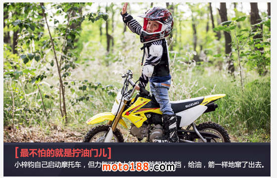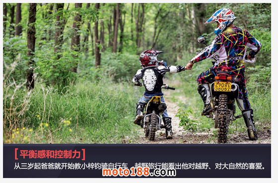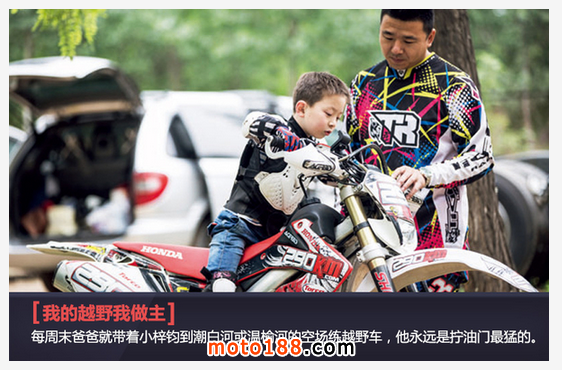 爸爸回憶說,在三四歲的時候,小梓鈞總是在家拿著爸爸的頭盔問什么時候他才能騎車,爸爸說長大就可以了,沒想到這一天來得這么快。現如今,每到周末爸爸就帶著小梓鈞到潮白河或者溫榆河的空場練習越野車,跟比他大一點的小朋友相比,似乎有種初生牛犢不怕虎的意思,小梓鈞永遠是擰油門兒更猛的那個。在小梓鈞心里,騎車和跑步一樣,開心就追著你跑,不開心就跑我自己的,總歸是一種屬于自己的生活,他說這叫“我的越野我做主”!