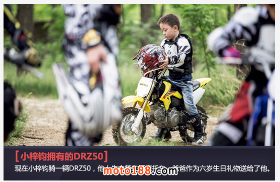 現在小梓鈞騎一輛DRZ50,讓人羨慕甚至嫉妒的是,這已經是他人生中的第二輛摩托車,在六歲生日那天爸爸作為生日禮物送給了他。第一輛是在4歲半時得到的一輛50CC小跑車,因為操控性能不如越野車好,僅有的幾次騎行也是速度非常慢,在爸爸的協助下完成。