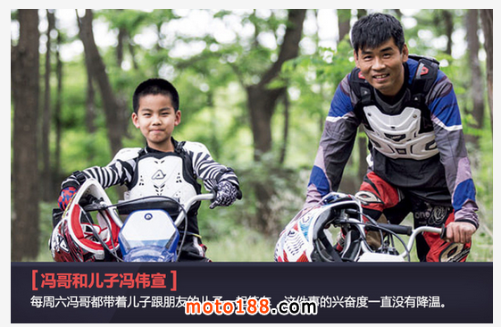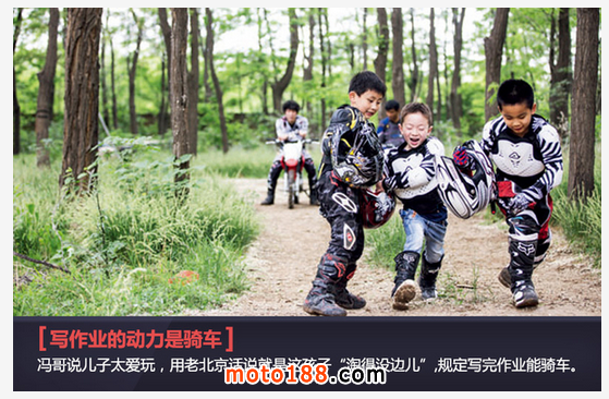 所有的不聽話只要牽扯到摩托車就有了一百八十度的轉變。三四歲的時候馮偉宣老在家玩兒馮哥的頭盔、手套和鞋,女孩喜歡穿著媽媽的高跟鞋走路,馮偉宣就喜歡在家穿著爸爸的越野靴子帶著頭盔晃悠,每次電視上轉播摩托車比賽,不管是什么類別的,保證坐在電視機前目不轉睛,帶著爸爸的頭盔感覺跟參賽選手似的特別入神。從這個時候開始,馮哥就決定等再長大一點就教他騎車。讓馮哥沒想到的是,曾經的不聽話、拖延癥都因為“騎車”這兩個字發生了質的改變,“現在跟他說寫完作業就能騎車,原來兩三個小時寫不完的作業半小時全寫完了,還有質量保證”。看來對于馮偉宣來說,任何誘惑都沒有騎車的魅力大,在七歲的馮偉宣眼里,只有騎車才是他的解藥。