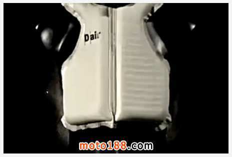 摩托車以一定的時(shí)速撞向汽車,來(lái)測(cè)試下碰撞時(shí)賽車服內(nèi)部彈出的氣囊,對(duì)駕駛?cè)说谋Wo(hù)效果