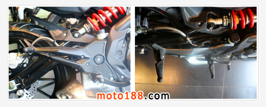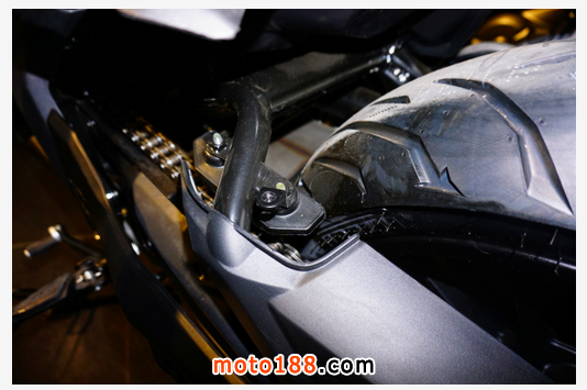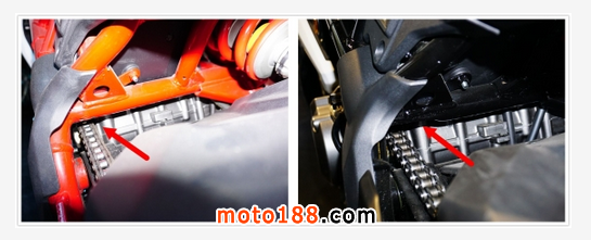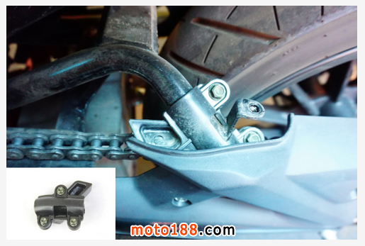 老款BJ300GS在鏈條松弛的情況下,會(huì)導(dǎo)致鏈條與車架、后搖臂接觸性磨損,上圖為錢江貝納利在數(shù)月前加裝的后搖臂防磨損組件。
