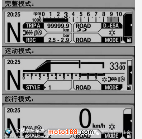 R1200RS的車載電腦可以在不同的儀表模式下,讓儀表盤顯示完全不同的內(nèi)容。 在完整模式下里程表,小里程表,剩余燃油里程,發(fā)動機溫度,速度,油耗,胎壓等等所有細節(jié)全部顯示。而在運動模式下則以顯示圖形化的發(fā)動機速度圖表最為醒目輔以其他簡單行車狀態(tài)。旅行模式則更加簡化,儀表盤上只有檔位和速度部分面積較大,其他狀態(tài)兼顧顯示。當然,更專業(yè)的包含計時器,電壓監(jiān)測,自動里程記錄等功能儀表也是作為選配供買家購買。