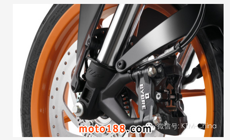 RC390 的編織式鋼管車架以Duke車架為基,但增加了后傾角,縮短了軸距和增加了離地距,令RC390的操控更敏銳,轉(zhuǎn)向極限更高。鋁合金尾搖臂和WP單筒尾避震都是高規(guī)格貨色,有極佳的抗扭性能和循跡表現(xiàn),有助提升操控。