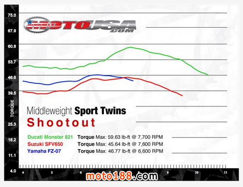 由于排量原因,怪獸821同樣具有扭矩的巨大優(yōu)勢,而SFV650和FZ-07的扭矩表現(xiàn),則與功率表現(xiàn)相反,雅馬哈有著更強(qiáng)的扭矩表現(xiàn)。