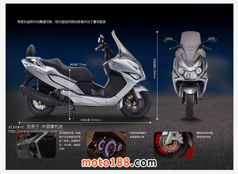 13年7月,帶著濃濃的法蘭西風情的Citystatr200i全球首發,優雅的外觀下是一顆狂躁的心。原裝進口GT200發動機最大功率可達14KW,配合MAP—FI電噴系統,集舒適性、低排放、低油耗為一體。車身大氣流暢,富有運動感,簡單而大氣。經典的家族式立體散熱格柵、C造型后尾燈、汽車級獅眼燈等無不體現出它的尊貴之處。智能發動機防盜系統更有效的保障車輛安全。除發動機外,電瓶、主線束,剎車片等14個關進部位均為原裝進口,生產標準完全的歐洲化,更大程度上的保障騎乘者的安全。