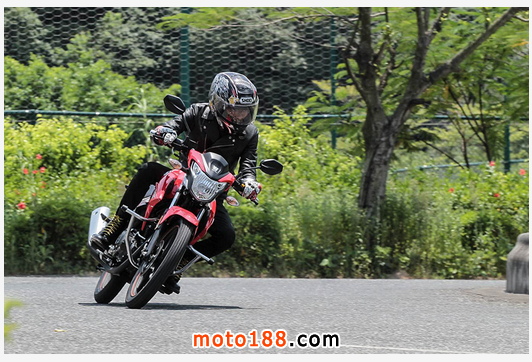 ↓下方兩張照片分別為KA150及KA125的彎道動態, 不細看的話, 幾乎無法分辨兩車外觀上的差異。事實上, 兩車的彎道操控感也幾乎是一樣的,同樣以操控靈巧見長, 但彎道傾角則不是此車的強項。主要原因在于原廠為兩車配置了較注重靈活性的前2.75-18后90/90-18胎寬較細的輪胎, 使傾角極限受到限制。