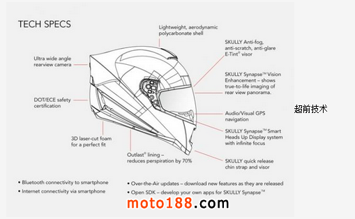 Skully AR-1 摩托頭盔的抬頭顯示信息整合自頭盔內(nèi)部的傳感器、微處理器以及攝像頭,另外附帶分段行進(jìn)式導(dǎo)航功能,能夠在距離車(chē)手約3米遠(yuǎn)的位置播報(bào)建議路 線,SKULLY 把這個(gè)稱(chēng)為Synapse(神經(jīng)突觸)系統(tǒng)。此外,這套系統(tǒng)采用了自動(dòng)無(wú)級(jí)變焦顯示技術(shù),這意味著無(wú)論車(chē)手以什么角度觀察,地圖在頭盔上的呈現(xiàn)都是最清晰 的。自然,所有的這些技術(shù)都是為了確保駕駛者將注意力放在路上的行駛車(chē)輛,而不是路牌路標(biāo)之類(lèi)的東西。考慮到這一點(diǎn),SKULLY 團(tuán)隊(duì)還為頭盔開(kāi)發(fā)了后視系統(tǒng)。AR-1的后視系統(tǒng)的功能類(lèi)似于汽車(chē)的倒車(chē)影像,不過(guò)AR-1的后視攝像頭是實(shí)時(shí)無(wú)死角全景式捕捉,拍攝的影像就顯示在抬頭 信息的正下方,易于觀察。韋勒介紹說(shuō),這項(xiàng)技術(shù)能讓駕駛者輕松又清楚地了解背后的環(huán)境,消除視覺(jué)盲點(diǎn),安全并線。這款頭盔通過(guò)藍(lán)牙與智能手機(jī)連接,續(xù)航能力達(dá)到了9個(gè)小時(shí)。韋勒認(rèn)為,這應(yīng)該是摩托車(chē)手(合理的)連續(xù)行駛的極限時(shí)間了。