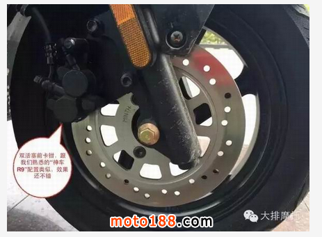 前剎車使用雙活塞卡鉗(和R9的類似),后剎車使用單活塞卡鉗(好像高仿鮑魚的),剎車油、手感、制動效果都不錯,可以保障安全制動