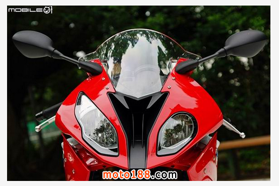 前擾流風鏡采用全透明風鏡鏡面,型狀與 2009~2014 的 S1000RR 不同,因此若要換裝較高角度的風鏡,需特別注意風鏡年分是否相同;風鏡不是全遮蔽設計,在后照鏡鎖點旁還有設計一組進氣道,讓直線趴車時也有氣流能導入騎士安全帽周圍,不至于過度悶熱。