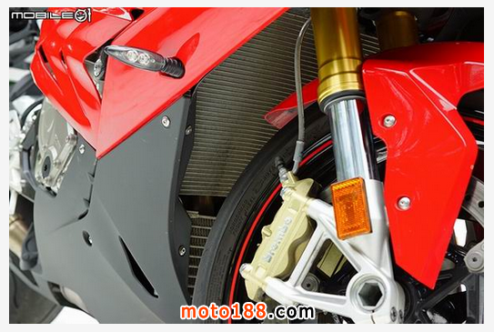 前輪后方具有大面積的散熱裝置,上方為水冷排,下方則是油冷排,兩種散熱器能夠確保高能車款的引擎溫度在控制范圍內。