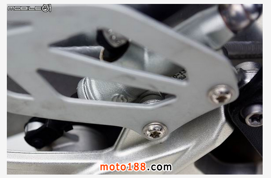 腳踏桿與打檔桿部分,S1000RR 的腳踏桿位置也是不可調整,不過打檔桿就有趣多了,仔細看會發現有兩個鎖點,圖中已經鎖上一組在打檔桿尾端,這樣是屬于正常的國際檔換檔模式,也就是從空檔踩下后進入一檔,往上用力勾進入二檔,再勾就進入三檔并依此類推,但當將球頭改鎖在后方位置,原本的一踩二勾轉變成為一勾二踩,覺得眼熟嗎?這正是比賽車會使用的反打國際檔!從空檔向上勾為進入一檔,一檔往下用力踩會進入二檔,再往下踩進入三檔并依此類推,這種換檔模式僅限賽道使用,最主要是因為在出彎時要升檔加速,用踩的比用勾的快又方便,因此在賽車場上大多數打檔車都是使用這種反打換檔的。