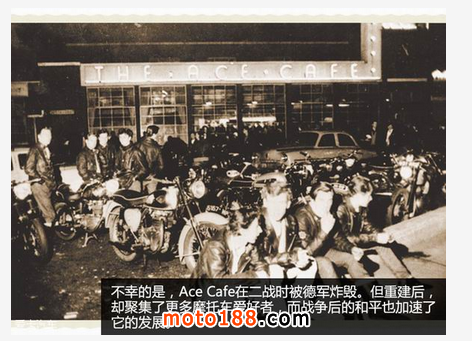Ace Cafe于1938年建成,是一家位于倫敦近郊的餐吧,它除了具備餐飲服務外,還提供摩托車的保養和加油。不過,在它開幕的前一年,發生在世界另一端的“盧溝橋事變”,卻已經揭開了戰爭的序幕。二戰中,Ace Cafe被轟炸倫敦的德軍轟炸機摧毀,直到1949年時才被重建。但也是從這一刻起,Ace Cafe開啟了屬于它的傳奇故事。